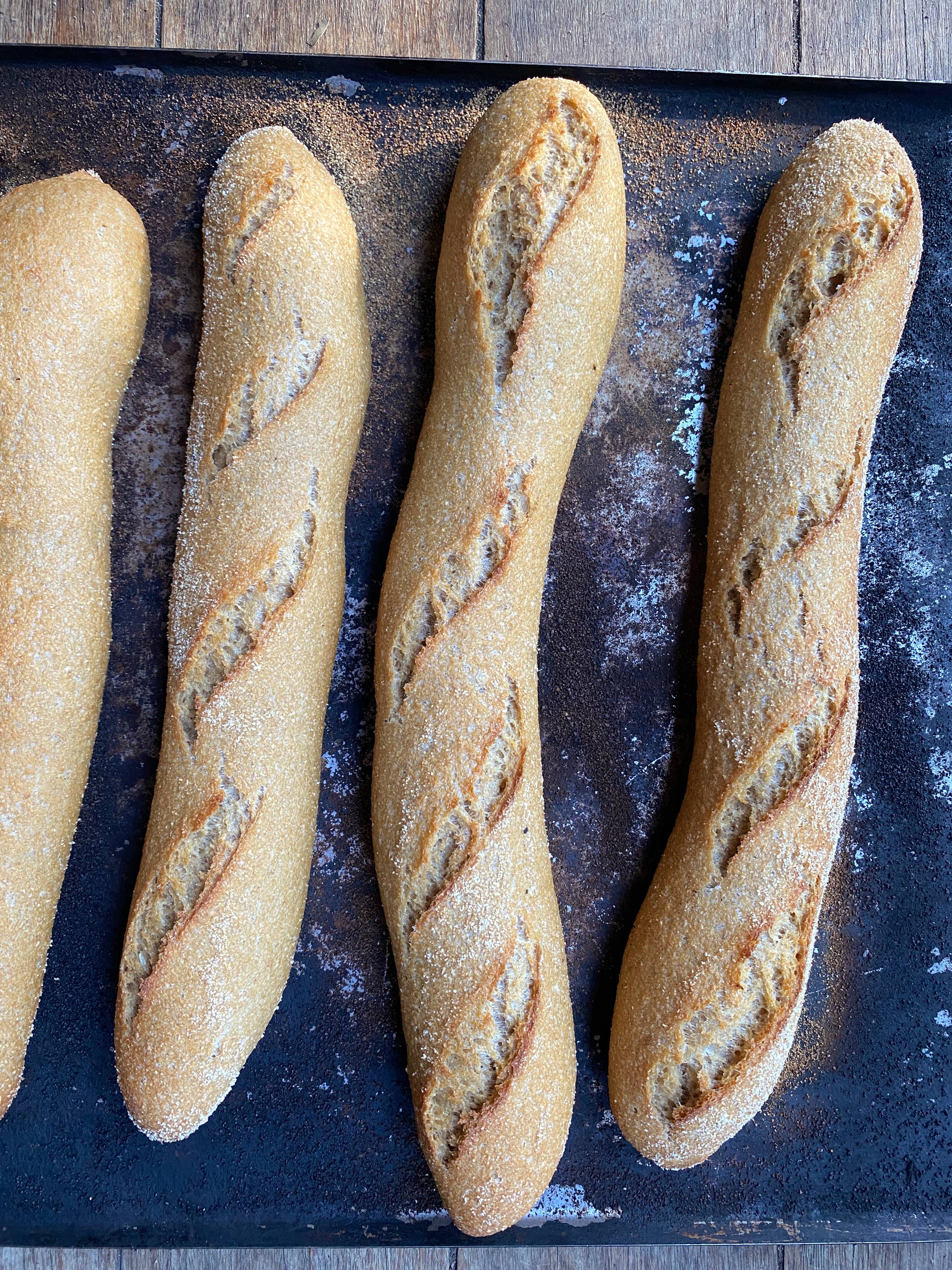 Lovely 100% whole wheat baguettes baked with pre-steaming the oven