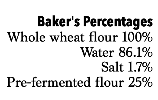 The percentage of pre-fermented flour (in the form of starter or leaven) will determine how rapidly the dough ferments, and this amount largely needs to be balanced with timing and temperature, and can be a changeable amount throughout the year, or can be changed around depending on how quickly (or slowly) you want to ferment your dough on a particular day. The pre-fermented flour is a part of the total flour that has already been calculated, rather than being extra flour that is added.